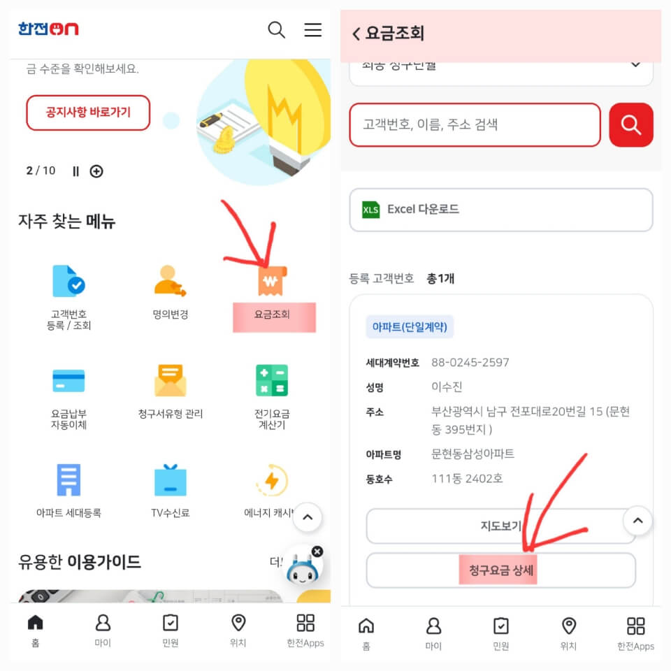 4, 세대 등록이 완료되며 홈 화면에서 요금조회로 이동합니다. 하단의 청구 요금 상세를 눌러 전기세를 확인할 수 있습니다.
