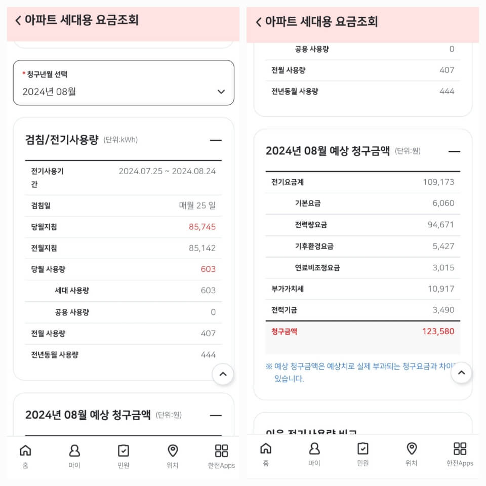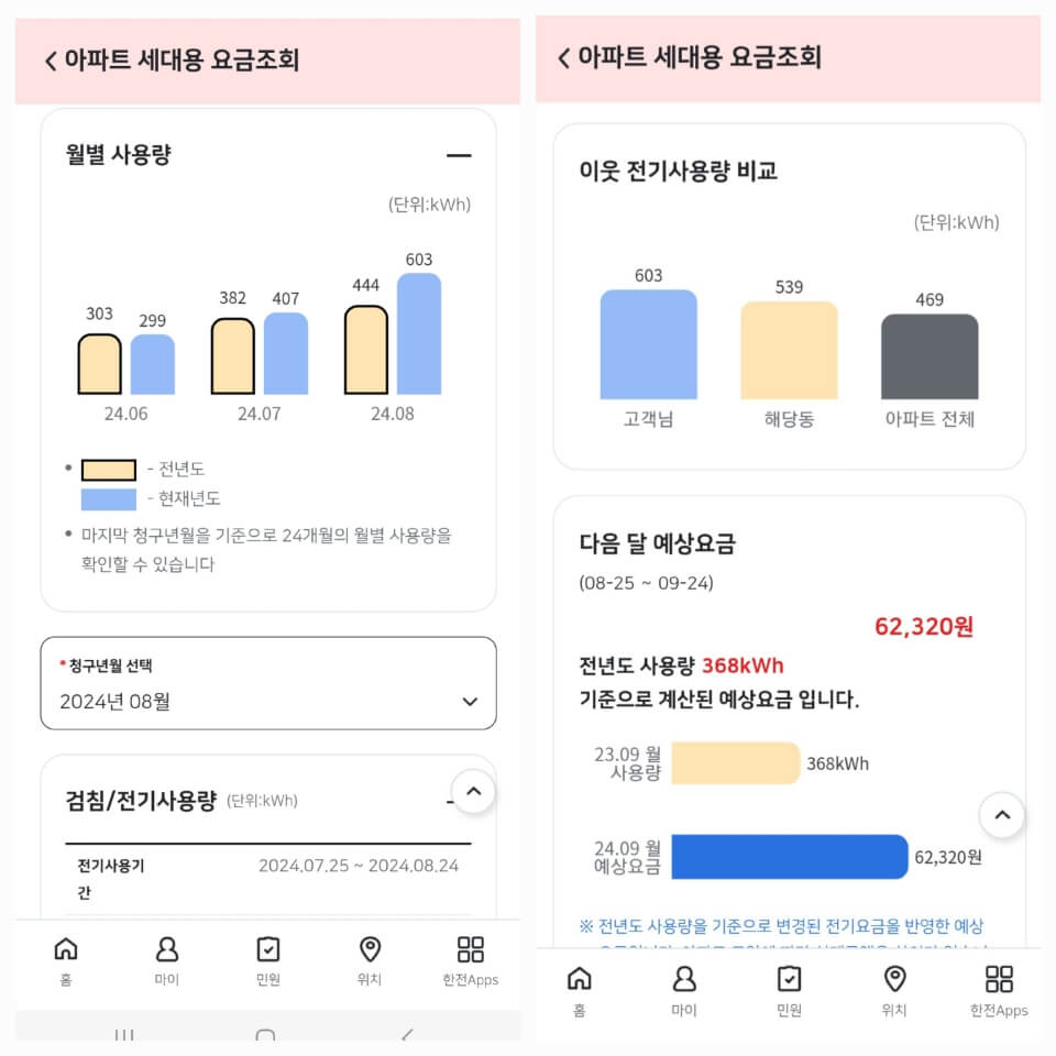 요금조회 화면에서 생각했던 것보다 상세히 확인이 가능한데요. 전기 사용기간, 검침일, 당월 사용량뿐만 아니라, 전월 사용량, 전년 동월 사용량까지도 확인할 수 있었습니다. 저희 아파트는 25일이 검침일이라 9월분 관리비에 청구되는 7월 25일 ~ 8월 24일까지의 전기요금(예상 청구 금액)만 아니라, 다음 달 예상 금액까지 확인이 되더라고요.
