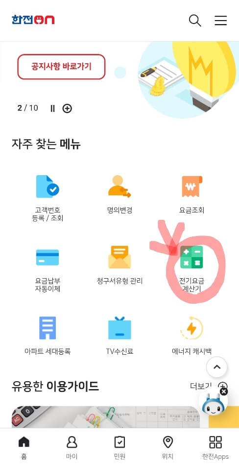 1. 한전ON 앱 홈 화면에서 전기요금 계산기를 눌러줍니다.