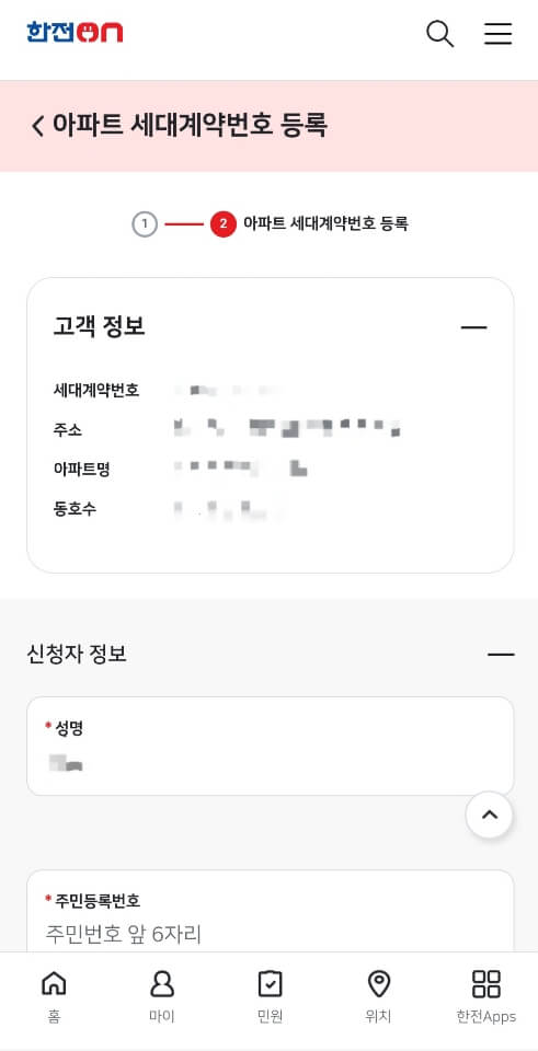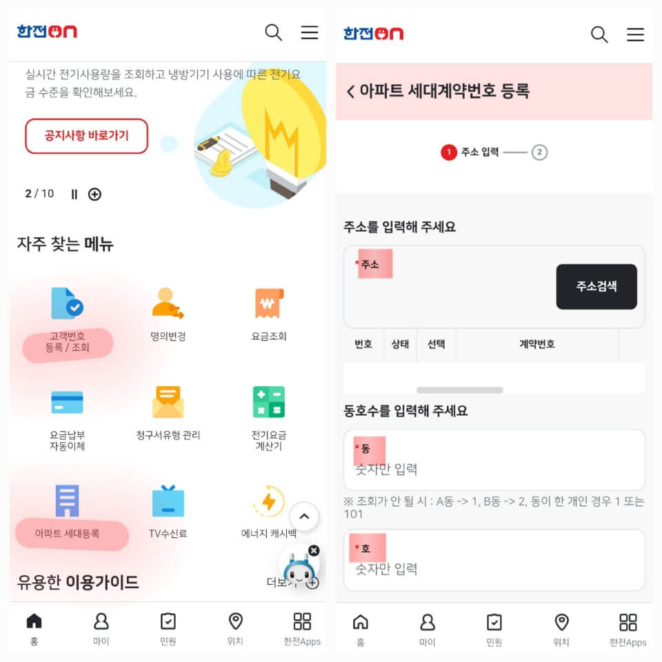 2. 한전ON 앱 실행 후 회원가입, 로그인을 합니다. 고객 번호 등록/조회 또는 아파트 거주자인 경우, 아파트 세대 등록을 눌러줍니다. 저희는 아파트라 아파트 세대 등록으로 진행하였습니다. 세대 등록 화면에서 주소 검색하여 아파트명과 계약 번호 확인, 선택 후 상세 주소까지 입력하면 됩니다.