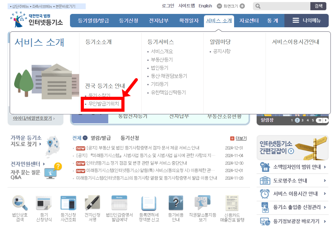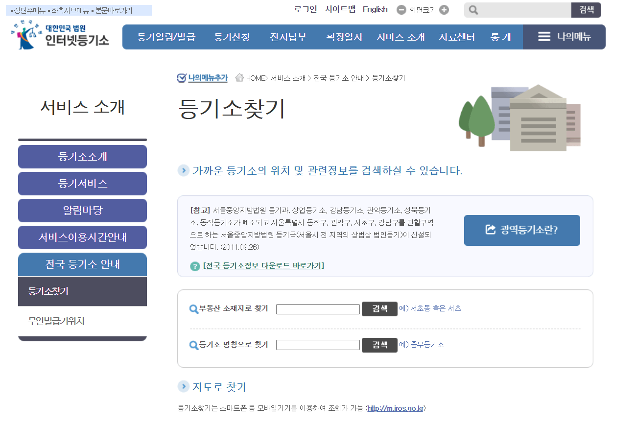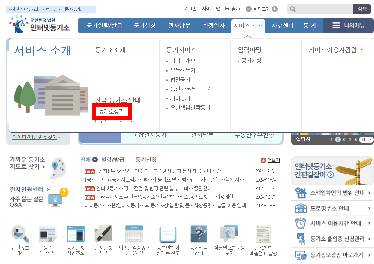 가까운 등기소는 인터넷 등기소 홈페이지에서 확인이 가능합니다.